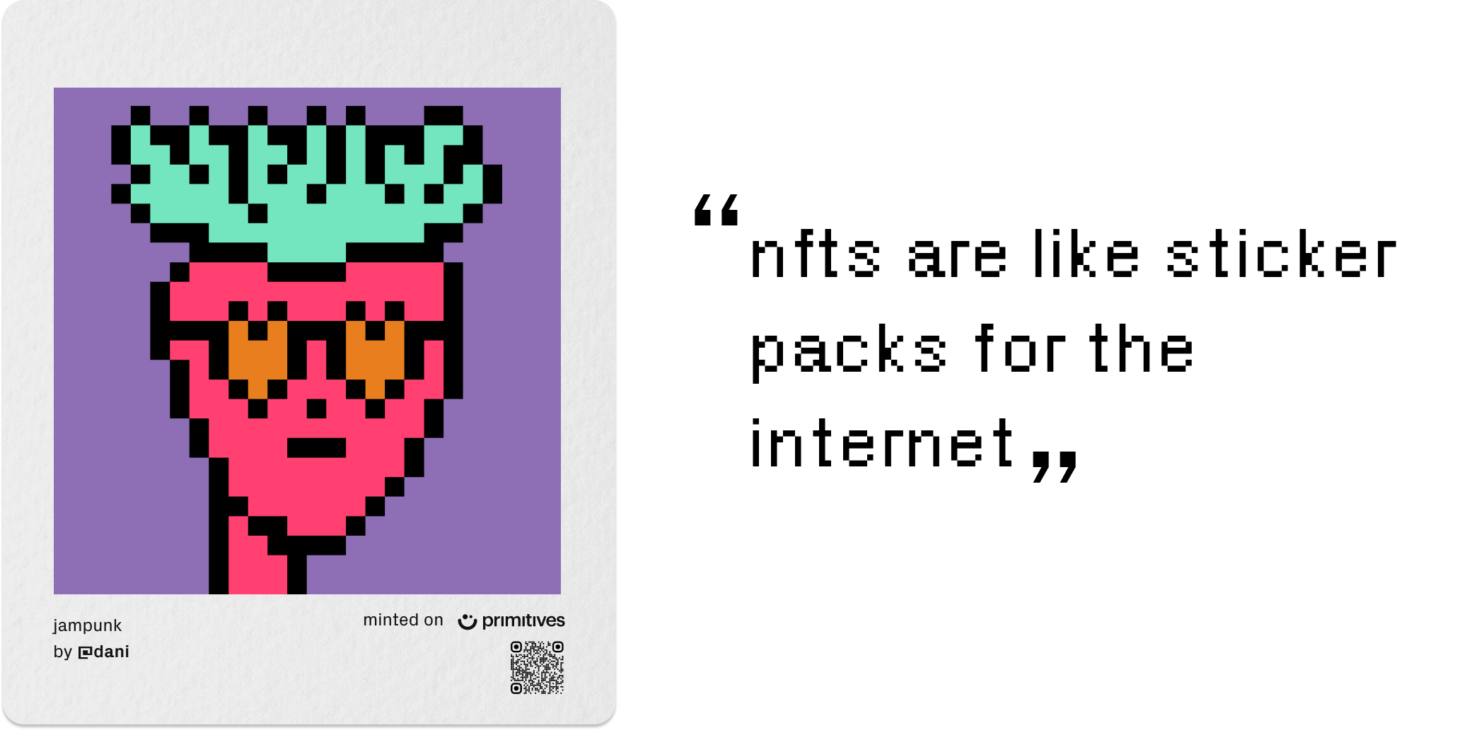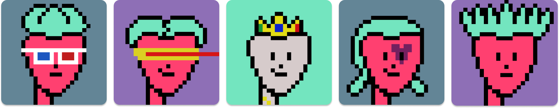 we're so grateful to everyone who has helped us share jam, and we wanted to give them something that felt fun and special as a way to say thanks. nfts are cute and fun, like sticker packs for the internet, so with Primitives’ help, we minted a special edition jam nft pack - different variations of jam’s strawberry logo, drawn as unique 8 bit-style punks, to send out to people who are helping us share jam.