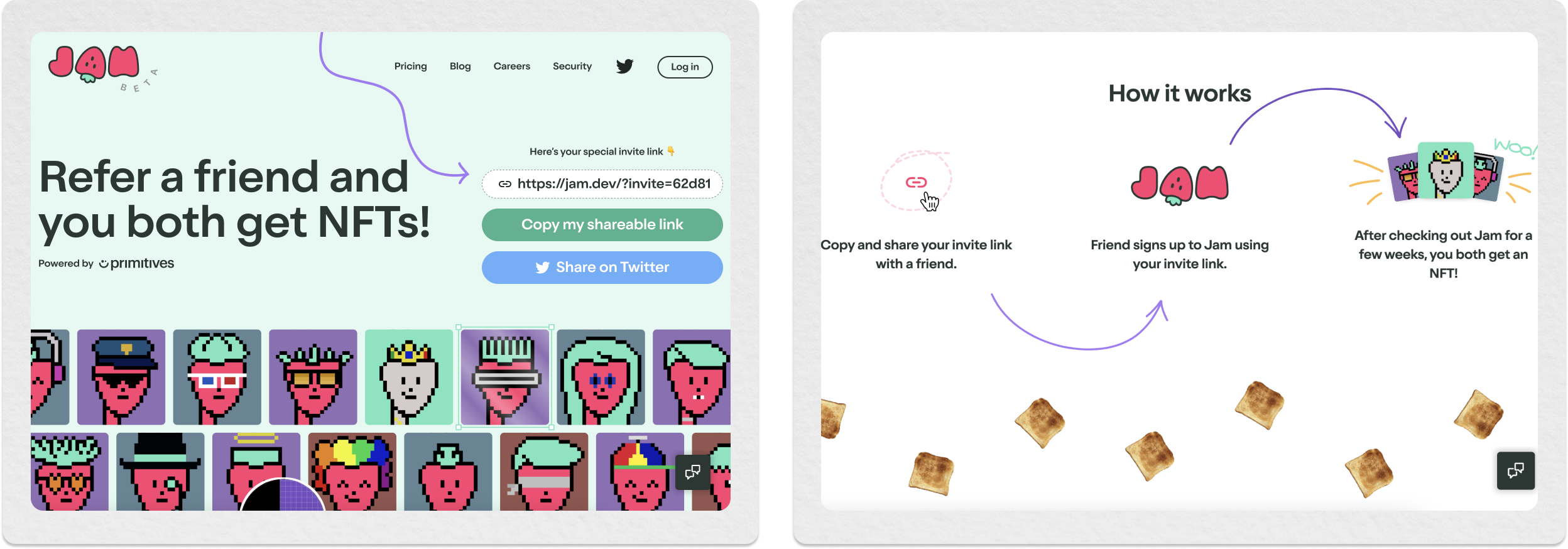 the most interesting challenge was how to design the referral experience inside jam. nfts are fun and silly, and while we wanted something playful, jam is also a serious bug-reporting tool that people use in their daily workflows. we didn’t want to undermine or disrupt that, but we also wanted to add a spark of joy, so designing it was pretty interesting. we ended up working with an amazing designer, stuart regan.